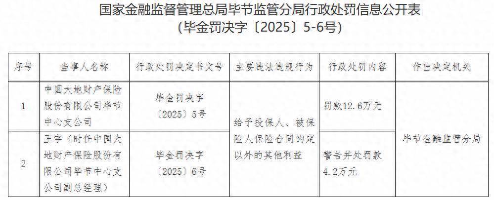 同时,毕节金融监管分局对时任中国大地财产保险股份有限公司毕节中心支公司副总经理王宇警告,并处罚款4.2万元。